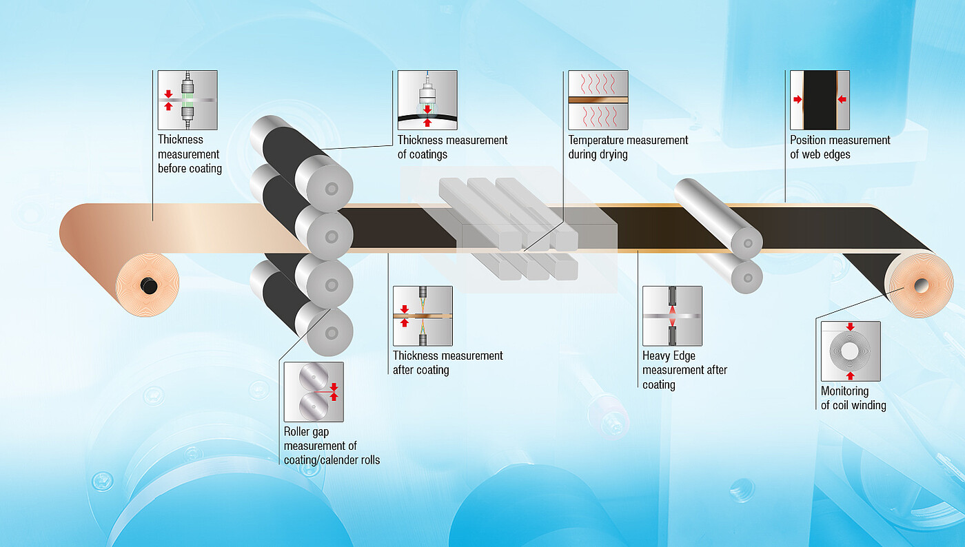 In the case of optical thickness measurement, confocal chromatic sensors really come into their own, as do white light interferometers for the inline thickness measurement of battery films. The sensors are typically used to monitor and control wet coating processes, but are also suitable for dry coating processes.