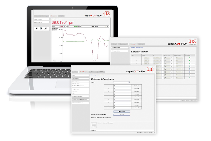 An integrated web interface offers user-friendly operation and can be accessed directly via a web browser without any complex software installation. Setup and configuration, data processing and visualization can be performed quickly and easily via the convenient user interface. Setups can be saved and loaded so that the configuration can be easily transferred to other controllers. Up to 8 channels can be visualized simultaneously and linked arithmetically.